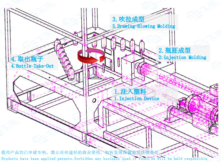 THS系列為全自動一步法注拉吹中空成型設(shè)備。此系列集合注射、拉伸&吹氣,產(chǎn)品脫模三個工位。利用注塑工藝的余熱進(jìn)行瓶子的吹塑成型,能源消耗顯著低于傳統(tǒng)的二步法成型設(shè)備。同時節(jié)省了人力和瓶胚貯存和運(yùn)輸成本,消除了瓶胚的中轉(zhuǎn)污染大大提高產(chǎn)品的競爭力。